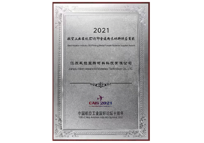 2021航空工业最佳D打印金属粉末材料供应商奖