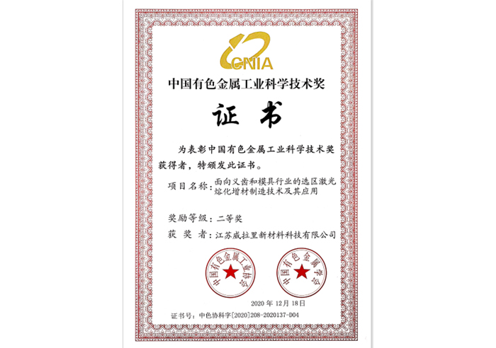 中国有色金属工业科学技术奖证书